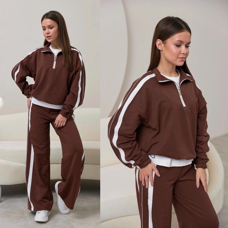 Стильный костюм украшен кантиком и трендовыми полосками стильная олимпийка свободного кроя с фиксаторами-столками по бокам и широкие брюки под резинку ткань турецкая двунитка пенье Супер качество! цена 1570 грн рост/длин.олимпийки/пог/рукав от горловины/длин.штанов/крок/пот/пос похибка+-2см 146/49/54/61/94/66/26/43-1шт 158/54/59/68/101/71/27/46-1шт 164/56/60/71/105/75/28/48-1шт