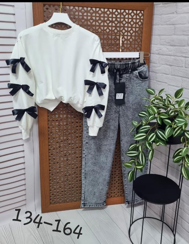 Модный лук джинсы багги и кофточка с трендовыми бантиками джинсы под резинку,меют рабочую шировку кофточка выполнена из ткани пенье, качество Турция ✅️Полномерные 🎀152-158-длина брюк 95,шак 69,пояс 29, поб 44, длина кофточки 52, пог 46,рукав от горловины 67 🎀158-164-длина брюк 98, крок 71,пояс 30,поб 45,длина кофточки 56,пог 47,рукав от горловины 68 🎀164-170-длина брюк 102,крок 74,пояс 32,поб 46, длина кофточки 58, пог 48,рукав от горловины 70 +-2 см