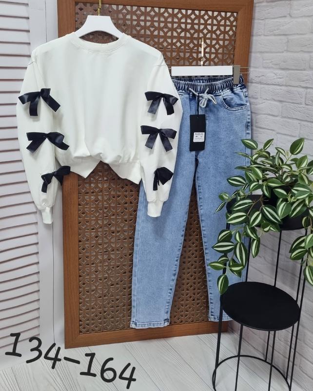 🥰Модный лук джинсы багги и кофточка с трендовыми бантиками джинсы под резинку,меют рабочую шировку кофточка выполнена из ткани пенье, качество Турция ✅️Полномерные 🎀134-140-длина брюк 81,крок 57,пояс 27, поб 41, длина кофточки 45, пог 42,рукав от горловины 58 🎀140-146-длина брюк 87,крок 60,пояс 27, поб 41,длина кофточки 47,пог 44,рукав от горловины 61 🎀146-152-длина брюк 90,крок 62,пояс 28, поб 42, длина кофточки 49, пог 45,рукав от горловины 65