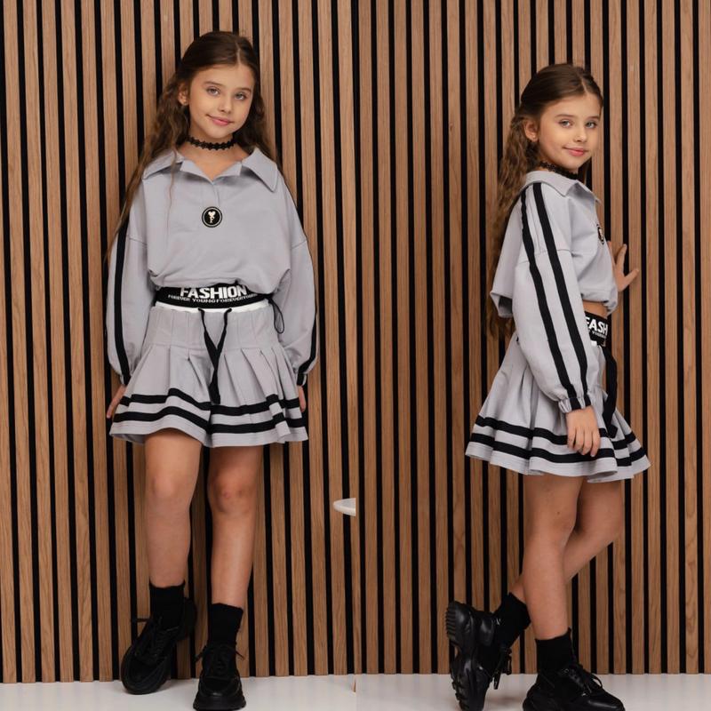 Гарний стильний трендовий костюм, пишна спідничка в поясі широка резинка світшот-поло на стяжках. дуже класна тканина двохнитка турецька пеньє. Супер якість Зріст/довж.світшота/пог/рукав від горловини/довж.спідн./пот похибка+-2см 140-146/36/55/53/36/29-1шт 146-152/38/56/54/38/31-1шт 152-158/40/57/56/41/32-1шт 158-164/43/58/60/44/33-1шт 164-170/47/59/66/48/34-1шт