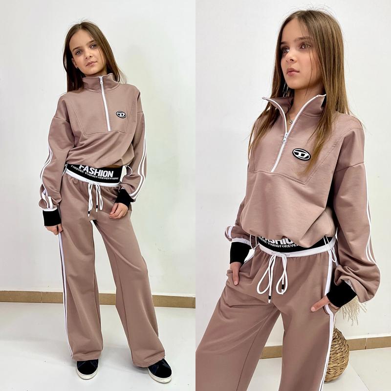 Костюм двойка свитшот имеет воротничок стойка на молнии низ на затяжках,рукавчик плотная резинка "дляг" штаны палаццо,пояс на широкой резинке,еет шнуровка ткань турецкая двунитка пенье ПОЯСЕ БУТЫ С ИНШИМ НАПИСИМ РЕКОМЕНДУЮ рост/длин/пог/рукав от горловины/длин.штанов/крок/пот/пос похибка+-2см 134/45/43/64/84/60/26/38 140/46/44/65/88/62/27/40 146/47/46/67/91/65/28/42 152/49/47/70/94/68/29/43 158/52/49/74/98/72/31/45 164/55/51/77/105/78/32/47