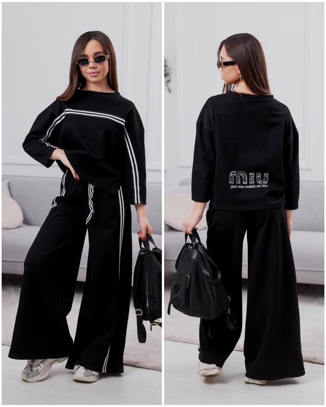 таня Костюм в стиле спорт-шик, в качественной дышащей тканевой лакосте, украшен трендовыми лентами по свитшоту и брюкам багги. Тканина-трикотаж лакоста. Супер качество Цена 1100 грн рост/длин./пог/рукав от горловины/длин.штанов/крок/пот/пос похибка+-2см 146-152/45/57/48/91/63/26/46-1шт