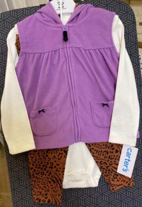 Новий дитячий комплект для дівчаток 3в1 Carter’s (фліс). Вік: 24 місяці (вага 12,5-13,6 кг, зріст 83-86 см) У комплект входить: бодік із довгим рукавом білого кольору (котон); флісовий жилет на блискавці та штани з котону. Вартість: 500 грн., самовивіз у м. Хмельницький або доставка.