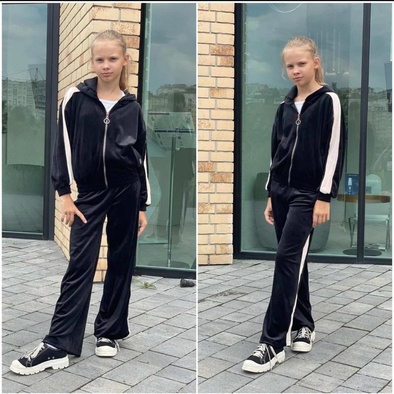 Стильный велюровый костюм с трендовыми лампасами. Кофта с капюшоном + штаны палаццо. Кофта застегивается на молнию, снизу на широкой резинке, есть карманы. Пояс брюк на резинке, есть карманы. Ткань - велюр, мягкая, очень хорошего качества. Цвет - черный+бежевые лампасы. Замеры: 134 кофта длина - 44см, полуобхват груди - 48см, рукав от горловины - 53см. брюки длина - 82см, шаг - 60см, пояс - 27см, полуобхват бедер - 43см. 140 кофта длина - 47см, полуобхват груди - 49см, рукав от горловины - 56см. брюки длина - 86см, шаг - 63см, пояс - 28см, полуобхват бедер - 45см. 146 кофта длина - 49см, полуобхват груди - 50см, рукав от горловины - 57см. брюки длина - 89см, шаг - 68см, пояс - 29см, полуобхват бедер - 46см. Мс