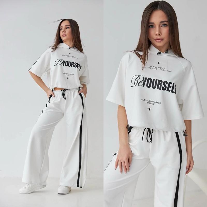 При оформлении заказа через кнопку Купить полная оплата, обязательно уточайте наличие размера Костюм с модным принтом укороченная футболка с капюшоном понизу утяжка впереди накат штаны широкие Багги со стяжкой по низу в поясе резинка (красиво тянется) и шнуровка есть карманы Ткань Турецкая двунитка Супер качество! Цена 1080 грн рост/длин./пог/дл.штанов/крок/пот/поб похибка+-2см 140-146/42/52/87/62/26/49 146-152/44/53/90/66/27/51 152-158/46/55/94/69/28/52 158-164/47/56/95/70/29/53 164-170/49/58/96/72/30/54