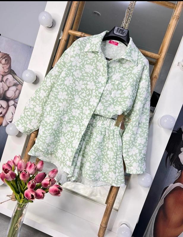 Арт 5066 Стильный костюмчик для девочки, нежность, и удобство сочетаются в нем непревзойденным образом. Ткань меслин, Сорочка на ґудзиках, шорты красиво садятся по фигуре, пояс на широкой резиночке! Качество очень красивое! Рост/длин.рубашки/пог/рукав от горловины/длин.шорт/пот похибка+-2см 146/60/46/61/31/28-1шт Тан