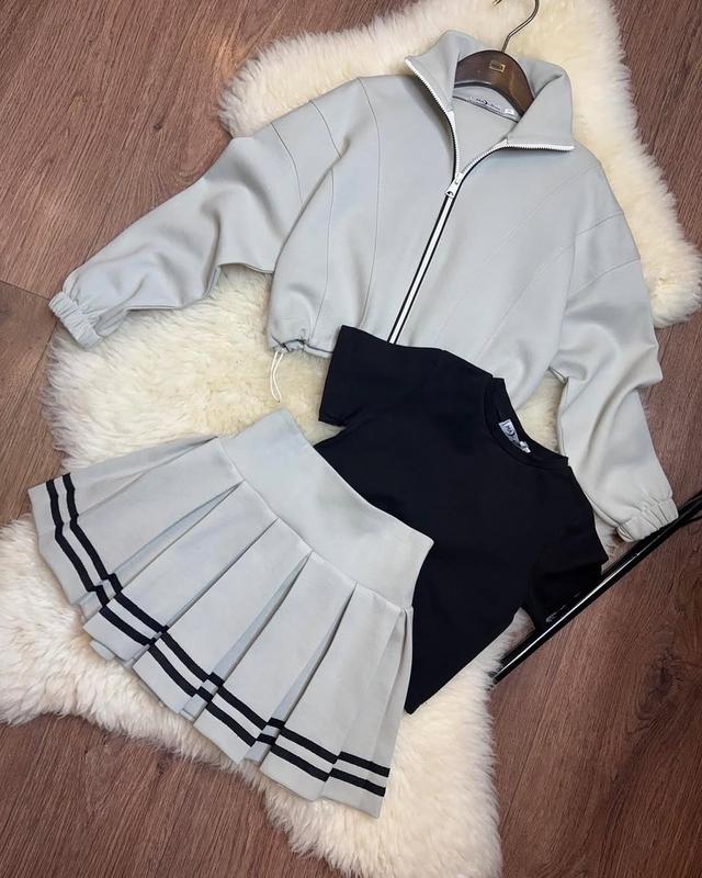 Стильный комплет тройка для девочки :кофта, футболка и юбка В комплект входит 3 вещи, которые можно компоновать с другими вещами в гардеробе: - кофта на застежке, имеет фиксатор объема по низу - юбка в складку - футболка, 100% хлопок, отличного качества Цвет серый+черный Ткань 2-х нить, дабл фейс, отличного качества Р.128,134,140,146,152,158,164 I N S T A G R A M: kids_style_rokytne