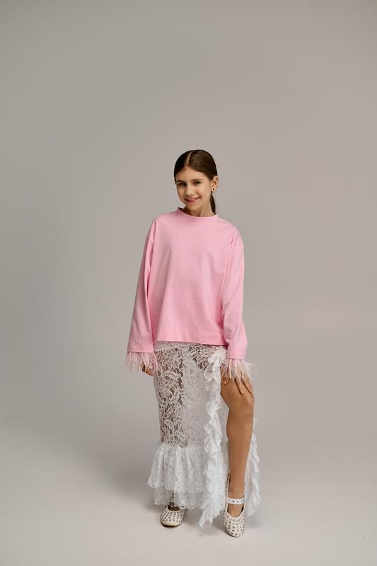 Костюм лонг розовый с перьями и юбка ажурная белая