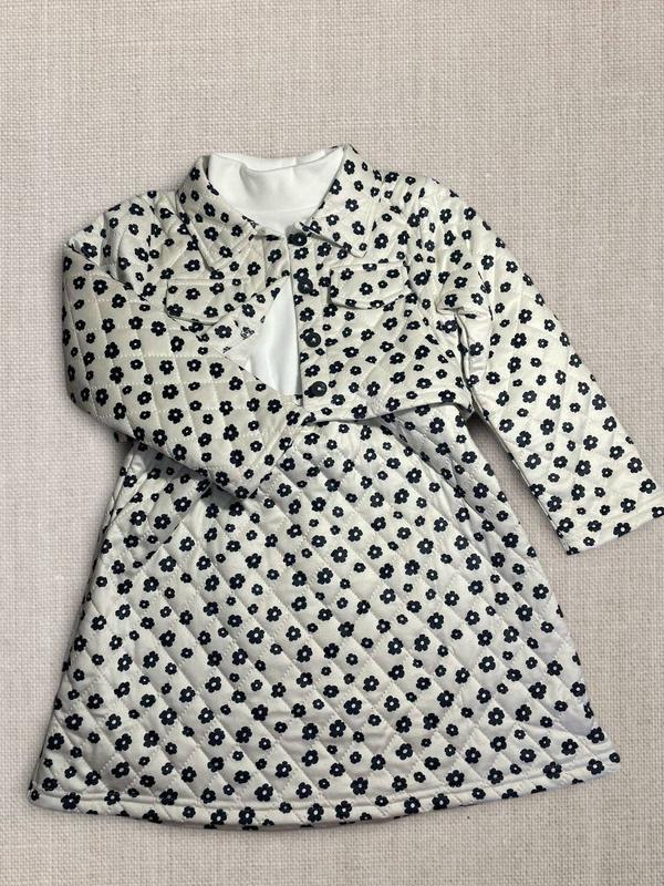 Новый комплект для девочки 6-7 лет: легкая курточка на пуговицах + кофта сшита с расклешенной юбкой. Мягкая простеганная ткань, стильный узор с цветочками. Идеально подходит для школы или прогулок в прохладную погоду. ✔ Размер: 122–128 ✔ Материал: 100% полиэстер ✔ Состояние: новый ✔ Температура: осень/весна (10–17 °C)