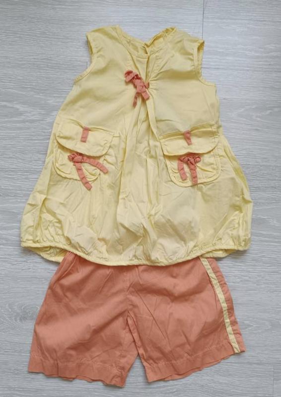 Яркий, классный костюмчик для девочки на возраст 98-104 см (быта до 110 см точно). На летечко. Легкий как перышко. Не парить. Склад 97% бавовна + 3% еластан. Замеры предоставленные. Спереди на блузочке бантиком можно регулировать ширину. Шортики талия на резиночке. Производство Украина.