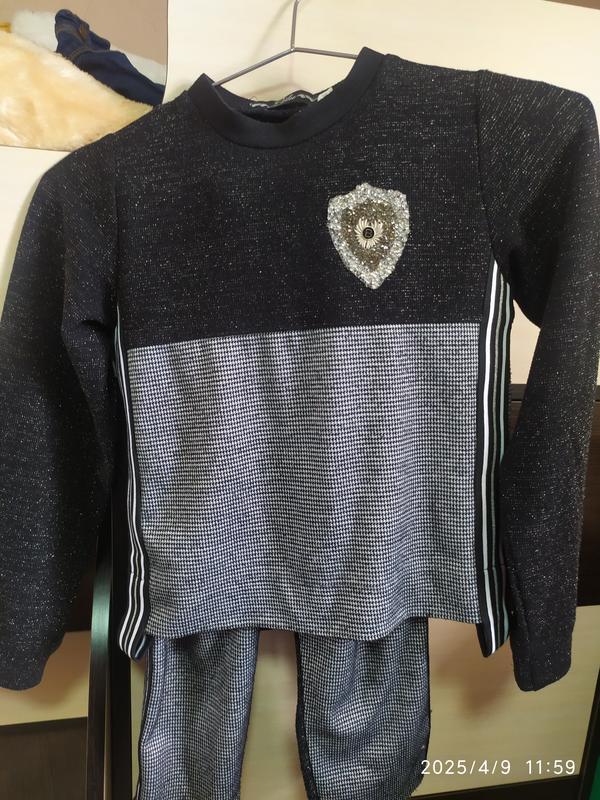 Прогулочный костюм гусиная лапка, а на черном люрекс, по наборке 140, сможете быть на 134.Штаны длина 79, крок 57,пояс 26, растягивается до 38.Кофта длина 44,рукав от плеча 51,ширина 39,плечи 29