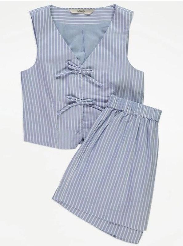 Летний комплект-двойка для ребенка. Состоит из стильного жилета и шортиков. Материал - легкий коттон. Жилет с хлопковой подкладкой. Застежка - скрытые пуговицы спереди, украшен бантиками. Шортики свободного кроя. Пояс - резинка. Состав: 100% хлопок Размер Жилетка Шорти Длина по спинке Ширина под руками Длина Пояс 6-7 лет 32 34 30 24 7-8 лет 33 34 31 24 8-9 лет 35 35 32 25 9-10 лет 37 35 33 26 10-11 лет 38 35,5 34 27 11-12 лет 39 36 35 28 12-13 лет 40,5 36,5 36 29 13-14 лет 42 37 37 30
