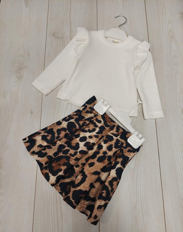 Стильный 🐆 костюм для девочки с леопардовой юбочкой. Размеры в наличии: 1,5-2р./86-92см.рост. 2шт. Кофта: плечи-23см. рукав от плеча-31см. длина-30см. ПОГ-27см. Юбка: пояс-23см.(есть боковой замочек) длина-28см. 4-5р./104-110см.рост: 2шт. Кофта: плечи-25см. рукав от плеча-35см. длина-34см. ПОГ-30см. Юбка: пояс-24см.(есть боковой замочек) длина-37см.
