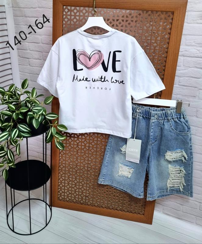 Модный и стильный костюмчик футболка + джининсовые бермуды футболка кулир премиум качества с красивым прорезиненным накатом Отличное качество! 140-1 шт 146-1 шт 152-1 шт 158-нет 164-1 шт 🌿140-длина футболки 48, пог 43,дл.шорт 50,пояс 27,шаг 21,поб 46 🌿146-длина футболки 50, пог 45,дл.шорт 51,пояс 28, крок 22, поб 47 🌿152-длина футболки 52,пог 47,дл.шорт 52,пояс 29,шак 23, поб 48 🌿158-длина футболки 54, пог 49,дл.шорт 53,пояс 30,шар 25,поб 49 🌿164-длина футболки 55, пог 51,дл.шорт 54,пояс 31, крок 26, поб 51 +-2 см