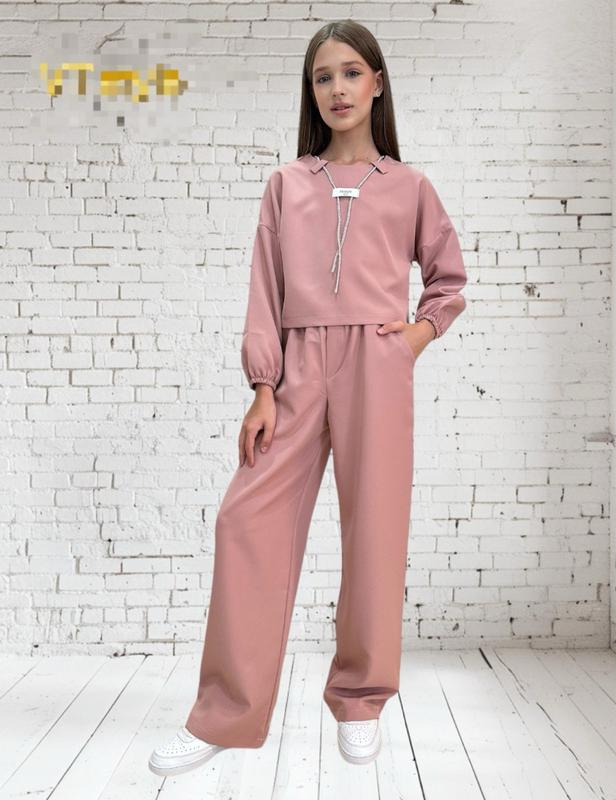 Очень красивый костюмчик для девочки, праздничный может быть либо на каждый день до школы, легковесная летняя ткань.По наборке 134,но будет на 140-146 и размер 158, будет на 158-164 Ткань костюмка. Штанишки палаццо. Блузка рукав идет 7/8(т.е. прикороченный!) Блуза по спинке замочек.Отправка укр и новая почта по предоплате