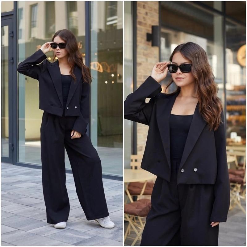 Модный и стильный костюм Жакет+ штани палацо Жакет застегивается на две пуговицы Пояс брюк по спинке на резинке Ткань - костюмка Цвет-черный 146-3 шт 152-1 шт 158-нет 164-нет 🍒146 жакет длина - 41, полуобхват груди - 41,рукав от плеча - 52, брюки длина - 92, шаг - 64, пояс - 27, полуобхват бедер - 49 🍒152 жакет длина - 42, полуобхват груди - 42,рукав от плеча - 54, брюки длина - 95, шаг - 66, пояс - 28, полуобхват бедер - 51
