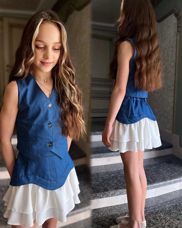 Стильный костюм Жилетка + юбка Тканина: котон + софт Супер красиво по фигуре Юбочка на спинке с резинкой Большемерят!!! Размеры: 128см 3шт 134см 2шт 140см 3шт 146см 3шт 152см 2шт Замеры: Жилетка: длина/пог Юбка: длина/бедра/пояс 128 - 41/34/33/37/26 134 - 42/35/35/38/27 140 - 43/37/37/39/28 146 - 44/38/39/40/29 152 - 46/39/40/41/30