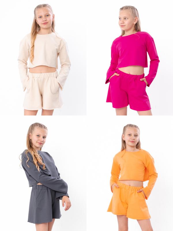 Через Шафу отправок нет❗ Комплект для девочки-подростка из двунитки, однотонный - это стильный, удобный и практичный вариант одежды для активного отдыха, прогулок или повседневной носки в теплое время года. В состав комплекта входит укороченная кофта с рукавами и шорты свободного кроя с карманами, которые обеспечивают максимальный комфорт и свободу движений. Кофта имеет современный дизайн: укороченная длина добавляет образу легкости и трендовости, а классические рукава обеспечивают защиту от ветра в прохладные дни. Шорты имеют удобную посадку на эластичном поясе, хорошо держится на талии и не сковывают движений. Наличие боковых карманов – это не только функциональность, но и дополнительный стильный акцент. Материал изделия – трикотаж двунить, идеально подходящий для подростковой одежды. Ткань мягкая, дышащая, хорошо держит форму после многократных стирок и не вызывает раздражений на чувствительной коже. Благодаря однотонной расцветке комплект легко сочетается с другими вещами в гардеробе. Такой костюм станет любимым вариантом для ежедневной носки в школе, на прогулках или в путешествиях. Стильный вид и комфорт — все, что нужно современной девочке-подростке.