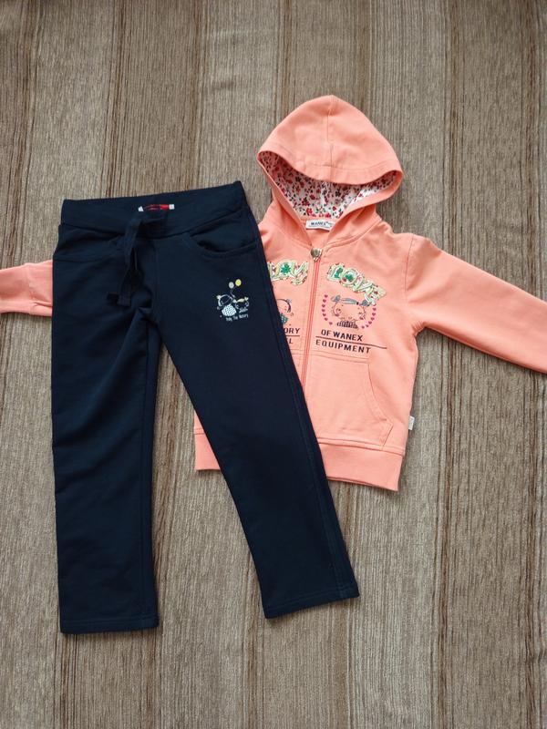 Хлопковый костюмчик на теплую весну- лето. Штанишки новые, ни разу не одеты. Кофточка в удовлетворительном состоянии. Замеры: Брюки: длина- 64 см, шаг- 47 см, п/о талии- 29 см. Батник- длина - 41 см, п/о комди- 34 см, рукав от плеча - 40 см, плечи - 29 см.