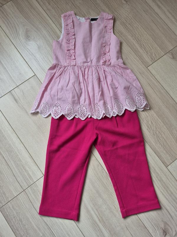 Отличный набор на девочку 3-4 года ( штанишки кюлоты малинового цвета и блузочка в полоску)! Вещи в идеальном состоянии!