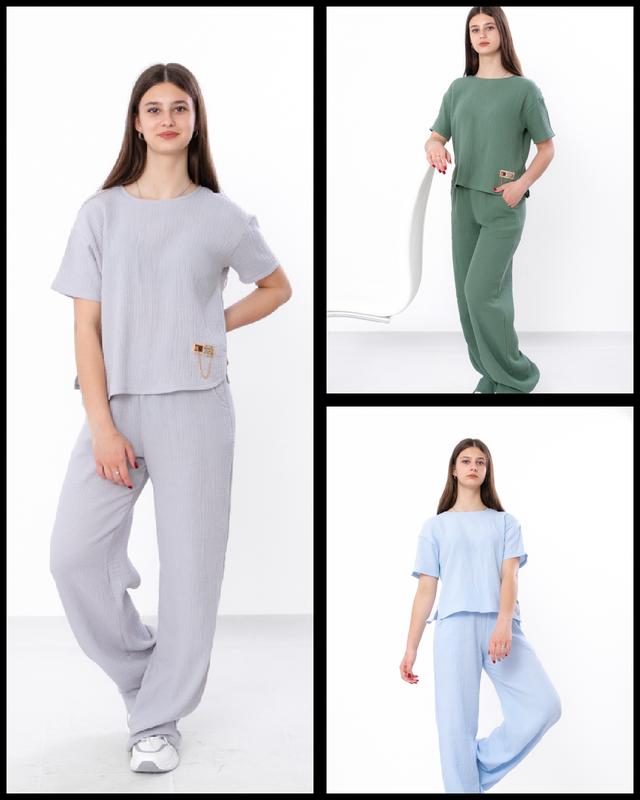 цена зависит от размера 140-590грн 146-630 152-650 158-670 164-690 170-720грн Комплект из муслина – идеальное сочетание комфорта и стиля для жарких летних дней. Сочетание натурального материала и свободного кроя делает его идеальным выбором для повседневной носки и прогулок по городу. Комплект состоит из блузы и штанов. Блуза изготовлена из мягкого муслина, что обеспечивает невероятную легкость и воздухопроницаемость. Круглый вырез и короткие рукава делают блузу универсальной для любого образа. На спине выполнена имитация застежки на пуговицы. Также на блузе есть небольшая нашивка в качестве декора. Брюки имеют свободный прямой крой, два кармана по бокам. Свободный крой позволяет коже дышать и обеспечивает максимальную свободу движений. Этот комплект позволит чувствовать себя комфортно в течение лета. Хорошо сочетается с босоножками, кедами или кроссовками. Рекомендации по уходу: допускается стирка при температуре не более 20°C, лучше стирать в прохладной воде, чтобы сохранить мягкость ткани. Гладить при низкой температуре.