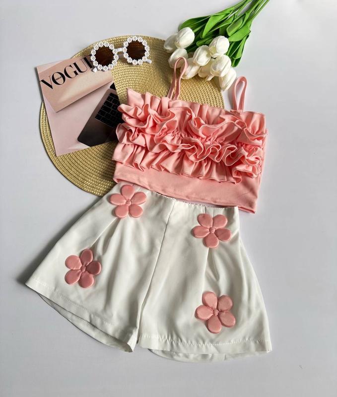 Матеріал: бавовна, легкий, дихаючий, приємний до тіла Заміри: р.110 - майка: довжина (від бретельки) 28 см, ширина 25 см; шорти: довжина 24 см, пояс 22 см р.120 - майка: довжина (від бретельки) 30 см, ширина 27 см; шорти: довжина 26 см, пояс 22 см р.130 - майка: довжина (від бретельки) 32 см, ширина 28 см; шорти: довжина 27 см, пояс 23 см р.140 - майка: довжина (від бретельки) 35 см, ширина 29 см; шорти: довжина 29 см, пояс 25 см