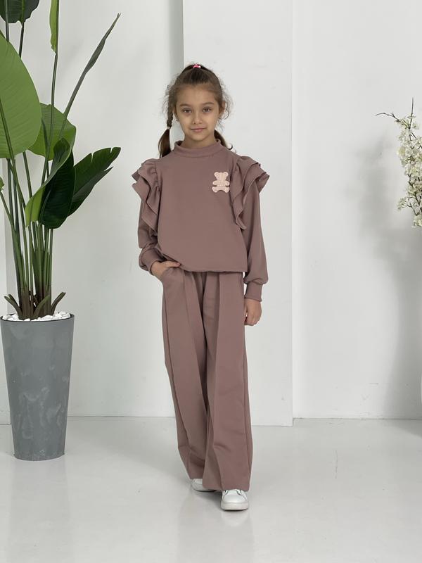 Стильный современный костюмчик для девочек из двунитки пенье (не скатывается) Кофта украшена по бокам рукавов рюшами, которые ее украшают.Спереди пришита эмблемка мишки.Рукава на манжетах. Брючки с выстрочкой спереди,с карманами, на резинке по талии, клешни Есть разм 104,110,116 Кому интересно пишите ответ Отпрашиваю новую почту, вукрпочта, предоставленной по предоплате,безопасная оплата на шкафу