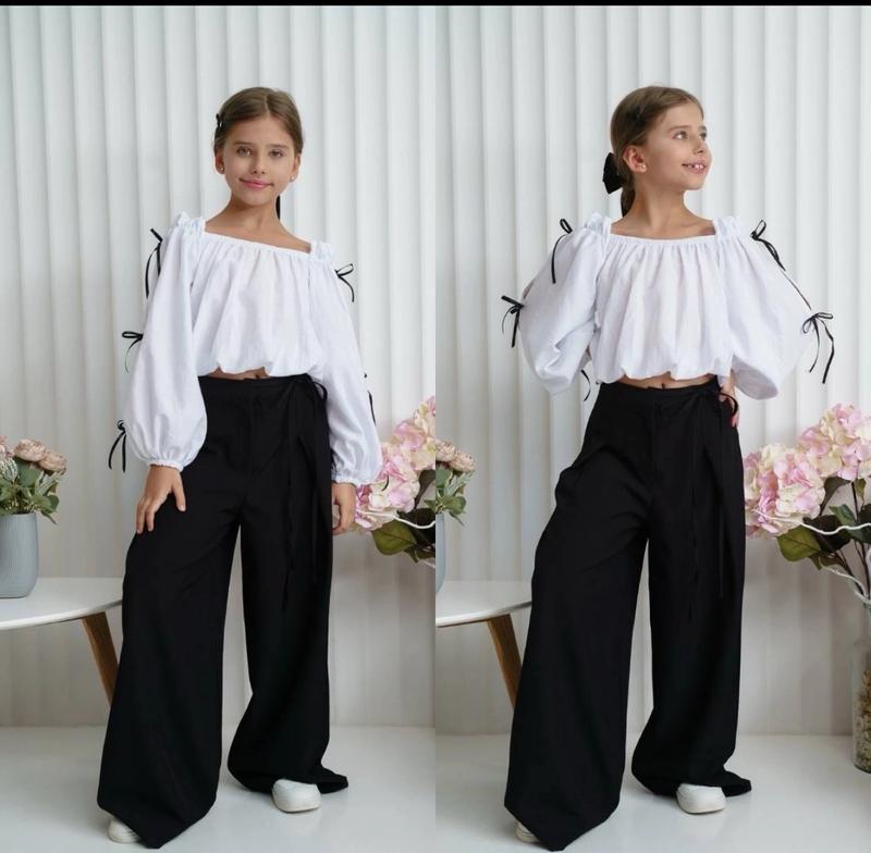 через кнопку купить только полная оплата!! арт 6638 Изысканный костюм Блуза с пышными рукавами украшенными разрезами и бантиками под резиночку Тканина штапель-жатка Брюки палацо в поясе сзади под резинку впереди застегивается на молнию и веревку Тканина костюмна ТІАР рост/длин.блузы от плеча/пог/рукав/длин.брюк/шак/пот/пос похибка+-2см 140-146/42/42/50/91/61/25/49-3шт 146-152/43/43/52/94/64/26/50-3шт 152-158/45/44/55/98/68/27/51-3шт 158-164/46/46/58/101/70/29/53-3шт 164-170/48/49/61/105/73/31/55-3шт Тан
