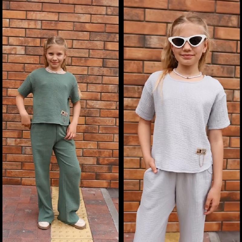 цена зависит от размера 140-590грн 146-630 152-650 158-670 164-690 170-720грн Комплект из муслина – идеальное сочетание комфорта и стиля для жарких летних дней. Сочетание натурального материала и свободного кроя делает его идеальным выбором для повседневной носки и прогулок по городу. Комплект состоит из блузы и штанов. Блуза изготовлена из мягкого муслина, что обеспечивает невероятную легкость и воздухопроницаемость. Круглый вырез и короткие рукава делают блузу универсальной для любого образа. На спине выполнена имитация застежки на пуговицы. Также на блузе есть небольшая нашивка в качестве декора. Брюки имеют свободный прямой крой, два кармана по бокам. Свободный крой позволяет коже дышать и обеспечивает максимальную свободу движений. Этот комплект позволит чувствовать себя комфортно в течение лета. Хорошо сочетается с босоножками, кедами или кроссовками. Рекомендации по уходу: допускается стирка при температуре не более 20°C, лучше стирать в прохладной воде, чтобы сохранить мягкость ткани. Гладить при низкой температуре.
