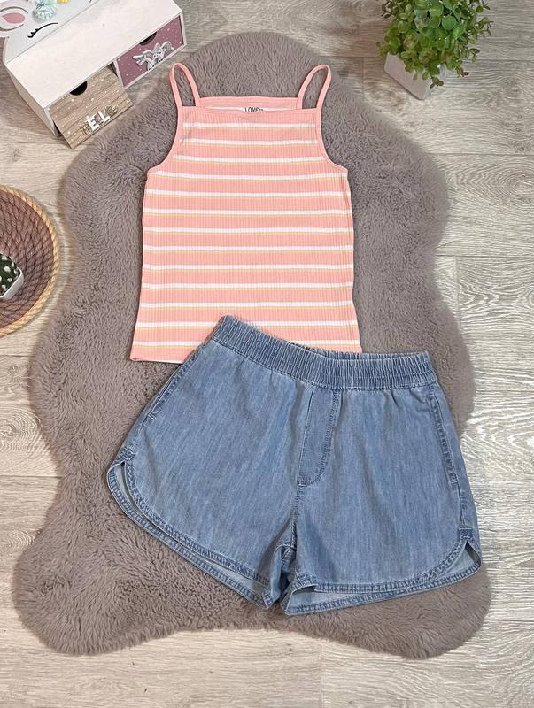 База на літо , стан речей ідеальний вільні джинсові шорти висока посадка, джинс не щільний та майка в рубчик, мягенька бавовна еластична підійде на 10-111р майка дов 48 пог 32 добре тягнеться шорти дов 32 крок 7 пот 31 резинка поб 46