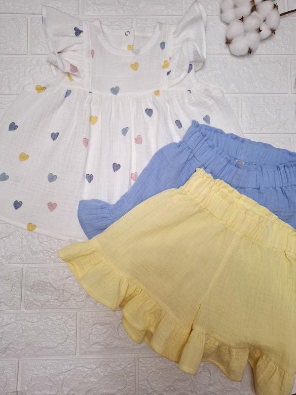 Літній костюмчик з мусліну для дівчаток 🌿 Розміри: 92–128 см Ціна: 750 грн Шортики можна обрати: 💙 блакитні 💛 жовті М’який, легкий, ідеальний для спекотних днів. ✔️ Власне виробництво ✔️ Відправка по Україні — 1–2 дні ✔️ Можливо пошиття за індивідуальними замірами ✂️ ✔️ Оплата 100% на рахунок ФОП 💳
