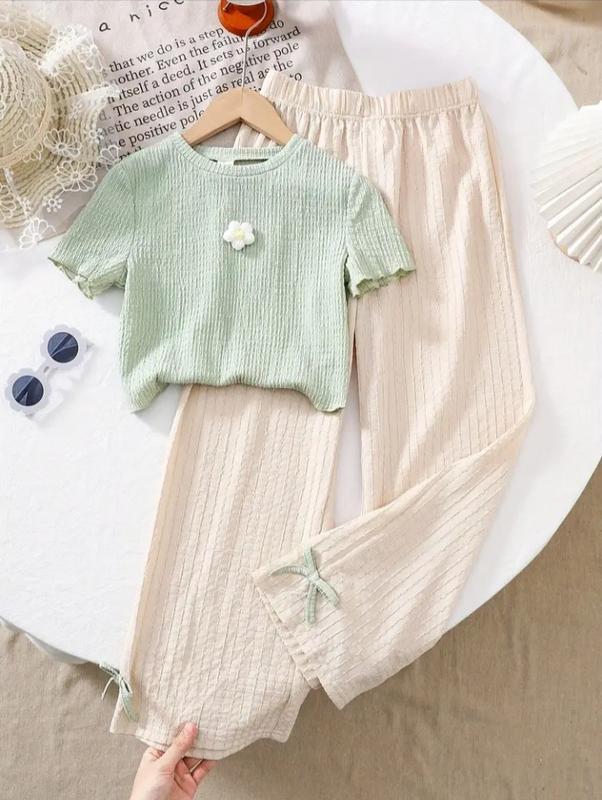 Летний легкий костюм Рзмер 146-150, 12 лет красиво подойдет на худи девочку. Костюм новый Брюки широкие, футболка свободная Тканина легка. Цвет: нежно бежевый и мятный, более яркий чем на фото. Декор: цветочек.