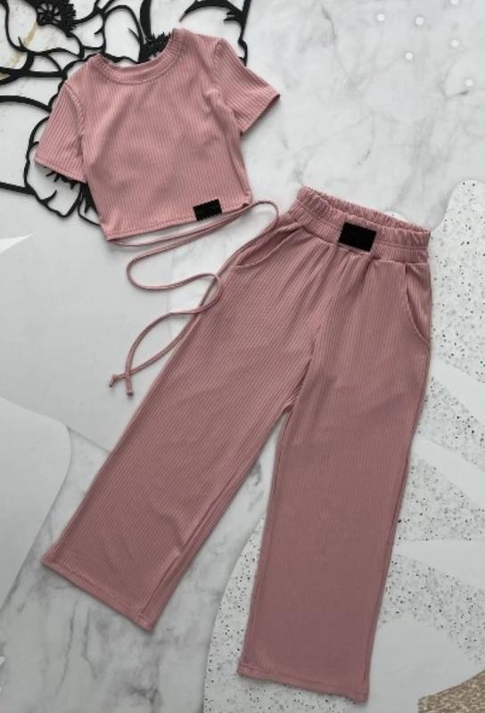 Тканина трикотаж "мустанг" рубчик. Відмінна якість. повноміри заміри розм/довж топа/ПОГ/довж штанів/шаг 128/30/30/79/56. 1 фот**********/60 1 фот**********/61 пудра kuds