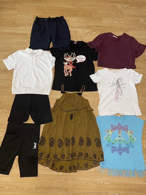 Всі речі після доньки. Все, що на першому фото. Зріст стоїть 160-158. Так і йдуть. Стан всіх речей гарний. 5 футболок, сукня дуже класна, бріджи-2 шт (одні нові) + шорти з карманами. Плюс ще одна футболка в подарунок.