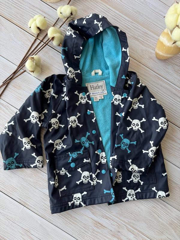 Синяя куртка, с капюшоном на мальчика 2-3 года Темно синяя куртка на мальчика, на текстильной подкладке, на ней есть катышки верх в идеальном состоянии. фирма hattey размер 2 состав 100% полиэстр брак: последняя кнопка сломана замеры: Длина 40 см рукав 33 см ог 39 см