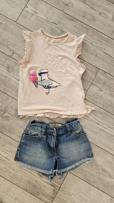 Просьба через кнопку КУПИТЬ оформлять после договоренности Стильный летний костюм комплект для девочки. Короткие джинсовые шорты Next. На талии резинка, можно регулировать объем. Стильная майка футболка свободного кроя с рисунком M&S. Подойдет на размер от 5 до 7 лет.