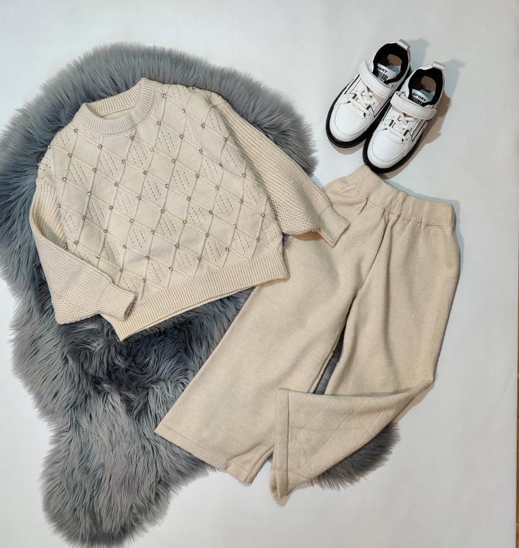 1330 грн Шикарний вязаний костюм для мальньких красунь очень приендован на ощупь плотна вязка пояс очень красиво тянется декорирован камушками замеры -длина куртки\пог\рукав от горловины\длина брюк\шаг\пояс 120-44\40\50\64\43\23 130-45\41\52\70\47\23 140-48\44\55\72\49\24 150-52\46\57\77\52\25 160-53\47\58\82\59\25 120-1шт 130-1шт 140-1шт 150-1шт 160-1шт