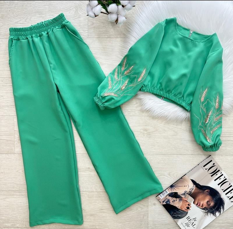 через кнопку купить только полная оплата!!! Невероятный костюмчик с золотистыми колотками 💙🌾💛 Стильный, нежный и легкий 🥰 Вкорочена блуза 🤩 сзади на молнии по всей длине 💖 Колоски- вышивка 😍 Штаны палаццо с кармашками 👌🏻 Ткань: костюмка барби ❤️ Производитель: Украина 🇺🇦 р.140-1шт ЗАМІРИ ⤵ +/- 1-2см!!! ◾р.140- Блуза: длина 34см/ рукав от плечевого шва 45см/ ПОГ 35см. Брюки: длина 90см/ шаг 66см/ ширина бедер 46см.