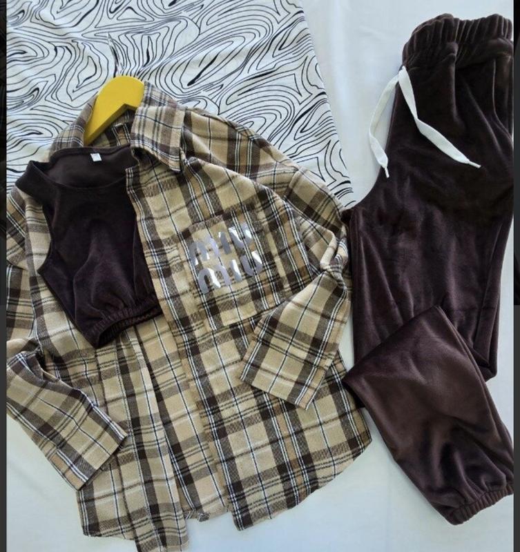 сорочка оверсайз+ топ +штани сорочка Тканина : турецька фланель сорочка. Джогери та Топ: королівський плюшевий велюр на бавовняній основі Дуже гарна якість!! заміри +-1-2 см Рубаха: р.122-128- довжина 61,5см/ рукав від горловини 60,5см/ півобхват грудей 45см- р.134-140- довжина 68см/ рукав від горловини 68см/ обхват грудей 100см- р.146-152- довжина 72см/ рукав від горловини 72см/ обхват грудей 104см- р.158-164- довжина 74см/ рукав від горловини 74см/ обхват грудей 108см- Джогеры: р.122-128 - довжина бокового шва 81см / крок 59см / талія 46см / стегна 78см р.134-140 - довжина бокового шва 92см / крок 67см / талія 50см / стегна 82см - р.146-152- довжина бокового шва 96см/ крок 69см/ талія 56см/ стегна 90см- р.158-164- довжина бокового шва 103см / крок 76см / талія 60см / стегна 93см- Топ довжина топа\пог 122-128-32\34 134-140-34\36 146-152-37\42 158-164- 39/43