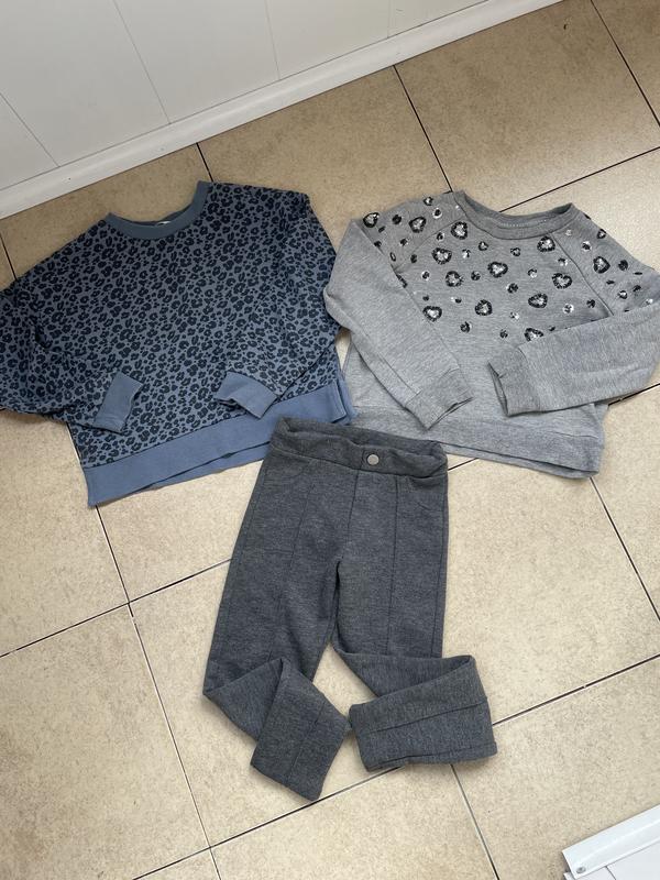 Продаю комплектом! Штани+кофта, або штани +2 кофти Плотні лосінки Зара на худеньку дівчинку, вказано 7 років, як на мене маломірить, дитина весь цей комплект носила в 5-6 років Синій світшот в леопринт манго, стан ідеал Сірий утеплений світшот. Ціна вказана за комплект з 3-ох речей Лосіни + 1 світшот - 500 грн