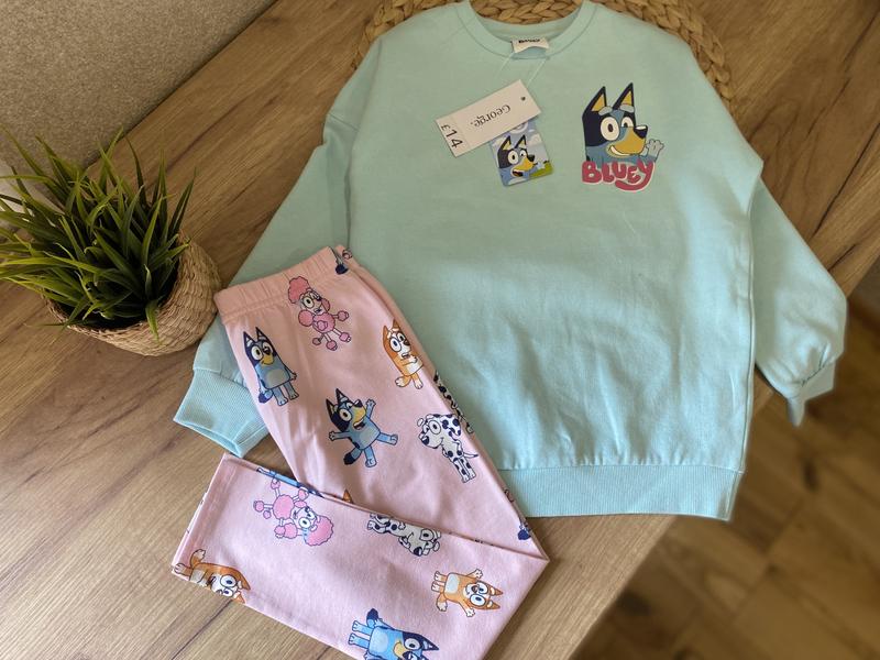 Комплект із 2 предметів Ребристий круглий виріз Довгий рукав з манжетами Принт з написом Блакитні візерунки з персонажами М'яка трикотажна тканина Ребристий поділ Еластичний пояс Штанина з принтом по всій довжині Склад тканини: 100% бавовна Розмір в наявності 5/6 років Світшот довжина 46см ширина 38см рукав від шиї 46.5см, Лосіни довжина 60см пояс 24.5см