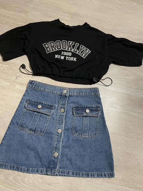 Стильный комплект спідниця+ футболка, топ. Разом комплект -170 грн Окремо кожна річ по 99 грн Спідниця вказаний розмір 10-11 років ПОТ-34-35 ПОБ-40 Довжина-37 Футболка -топ Вказаний розмір 140 Оверсайз Збоку регулюється ПОТ-45 Довжина-33