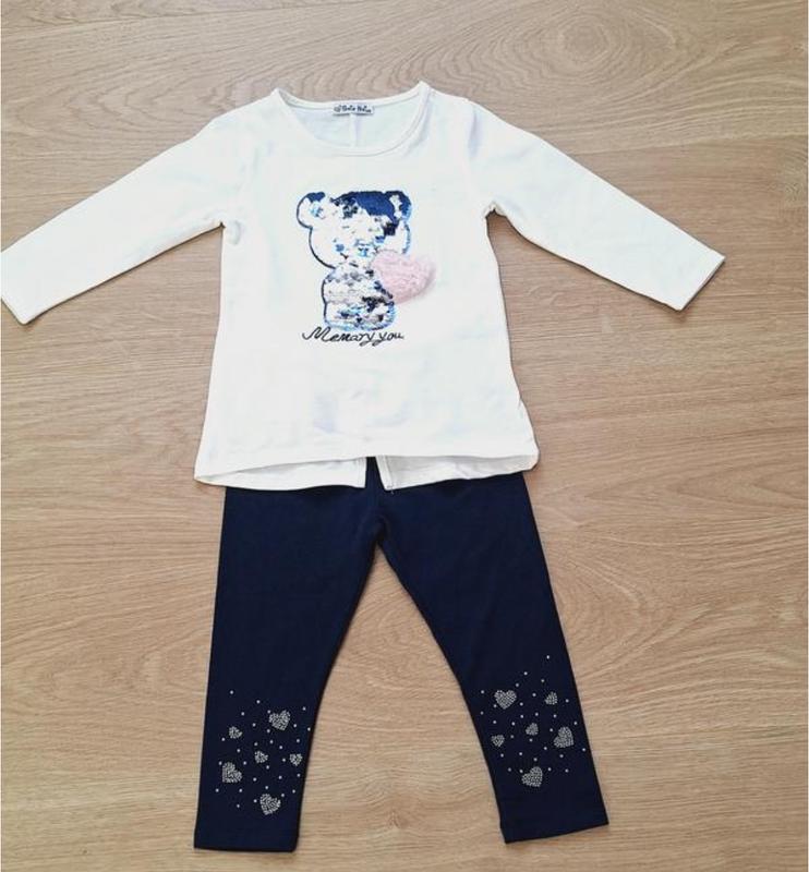 Костюм на 3 р., довжина кофтинки 40 см, довжина рукава від плеча 30 см, обхват під руками 56 см, довжина штанів 48 си, обхат талії 40 см