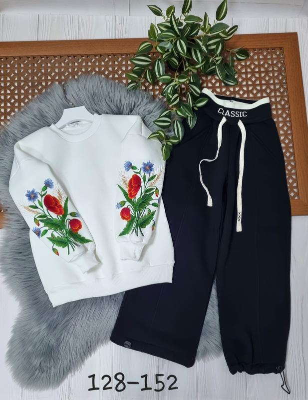 ВИДОВЫЙ ТЕПЛИЙ КОСЛОМЧИК свишот + штаны ткань трехнитка пенье туречки на флисе свитшот с вышивкой устойчив к катошкам РЕКОМЕНДУЮ! 💕128(1 шт)-длина свитшота 53, пог 42,рукав от горловины 58,длина 81,шаг 57,пояс 25 💕134(1 шт)-длина свитшота 55, пог 44,рукав от горловины 62,длина 85, крок 60,пояс 26 💕146(1 шт)-длина свитшота 60, пог 48,рукав от горловины 67,длина 91,шак 66,пояс 28 +-2 см ✅️Цена 1420 грн