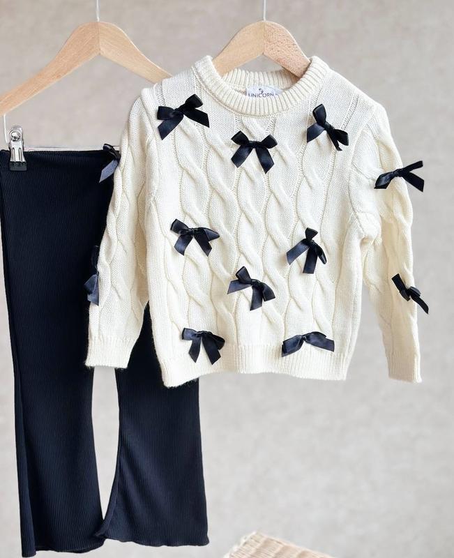 светрик з бантиками, мʼякий приємний до тіла, в комплекті з штанами палаццо в щільний рубчик. Пояс на мʼякій резинці. Преміум якість - 98 (2/3р) - 104 (3/4р) - 110 (4/5р) - 116 (5/6р) - 122/128 (8/9р)