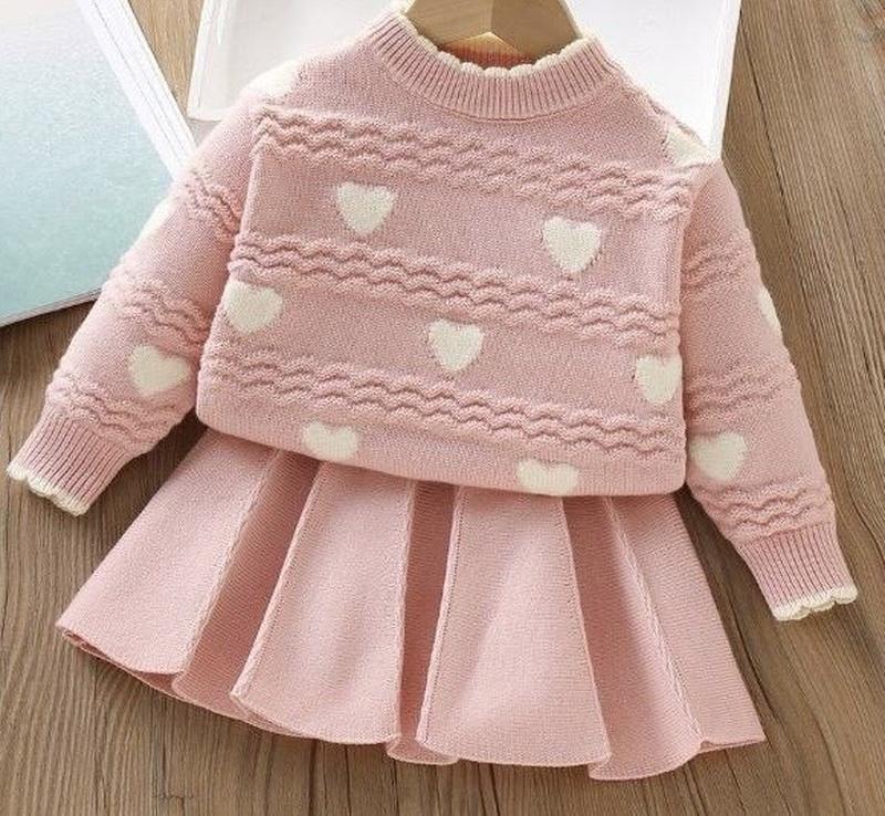 В’язаний светрик із яскравим візерунком у вигляді сердечок. М’який, теплий, приємний на дотик, добре тягнеться та не колеться. Плісирована в’язана спідничка у тон — легка, охайно виконана, зі світлим кантом по низу Гарно тримає форму та створює дуже милий силует. Виміри 90-Довжина 35 см Рукав від горла 35 см ширина 31*2 см Довжина спідниці 26 см пояс 19*2 см 100-Довжина 37 см Рукав від горла 38 см ширина 32*2 см Довжина спідниці 27 см пояс 20*2 см 110-Довжина 39 см Рукав від горла 39 см ширина 33*2 см Довжина спідниці 28 см пояс 21*2 см 120-Довжина 42 см Рукав від горла 42 см ширина 35*2 см Довжина спідниці 30 см пояс 22*2 см 130-Довжина 44 см Рукав від горла 44 см ширина 36*2 см Довжина спідниці 31 см пояс 22*2 см