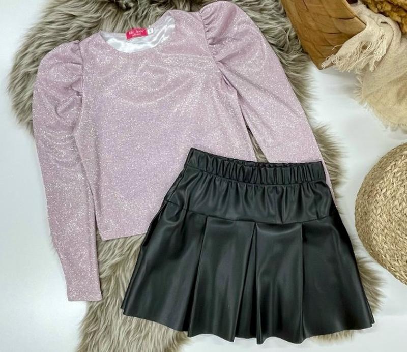 Праздничный костюм, который так нравится всем девочкам! ткань диско и эко кожа на замше. Выглядит ярко и приятно к телу! Юбочка в поясе под резинку. рост/длин.блузки/пог/рукав от плеча/длиной.юбки/пот 134/40/33/49/34/26 140/42/35/51/35/27 146/44/37/55/36/28 152/45/39/57/37/28 164/48/43/64/39/30 и.Р.