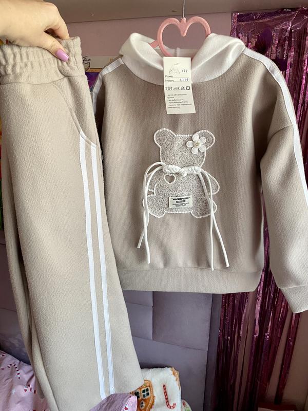 Стильный теплый костюмчик По бірці 122 р Кофтинка нова Брюки одеты 2 раза Длина брюк 70 см,пояс на резинке 23 см Шаговой шов 52 см Длина кофточки 46 см Рукавчик от шеи 48 см Ширина под ручками 43 см Купляли за 1200