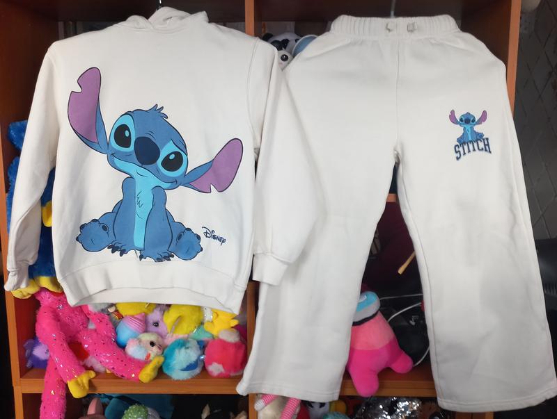 Размер: 9-10 лет (на рост 140 см). Плотный трикотаж с начесом (флис), цвет - экрю (молочный). Крупный принт Стэча спереди на худи и надпись "STITCH" на спине. Брюки имеют свободный крой и небольшую эмблему персонажа.