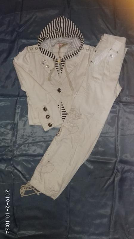 Рост 140, 164. По талии утяжка. Цвет молочный. Полосатая вставка и капюшон отстегиваются, получается пиджак.